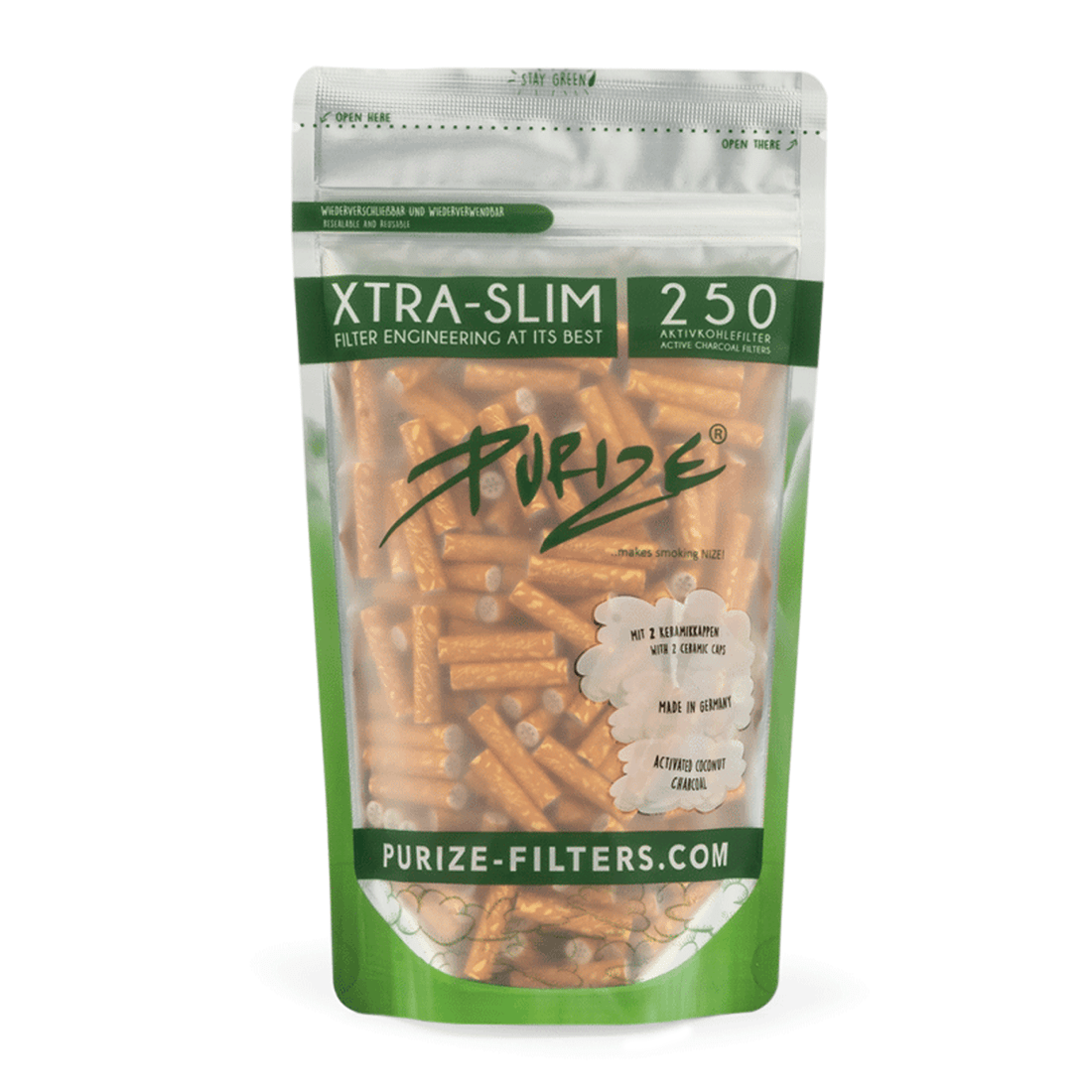• Filtre PURIZE EXTRA SLIM cel mai mic filtru, livrat într-un plic practic și resigilabil, conceput pentru o experiență de fumat curată, uscată și aromată.