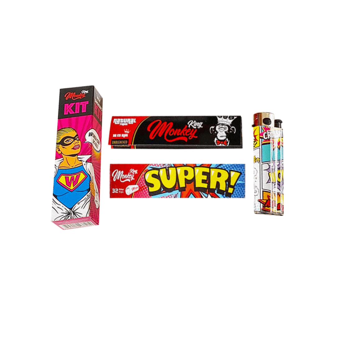 Fiecare kit conține hârtie de rulat premium Monkey King, filtre și brichete de la marca Atomic.