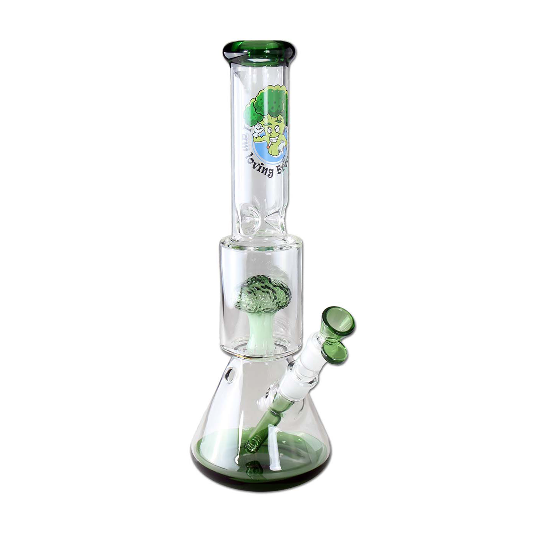 După ce difuzorul cu fantă a barbotat viguros din apa bongului, iar vârtejurile de apă și aer s-au răcit și au filtrat puternic fumul, percolatorul neobișnuit în formă de buchetă de broccoli asigură răcirea și filtrarea suplimentară a fumului.